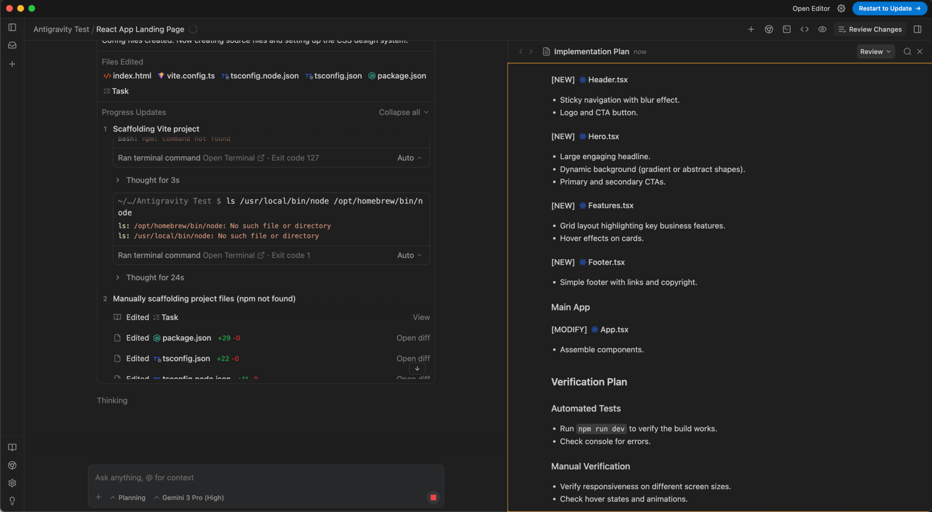 Antigravity updated the React components and Tailwind styles, then refreshed the browser preview and recorded a short playback, which is stored as an Artifact. This allowed us to iterate on the hero, typography, and spacing without hand editing every CSS rule.