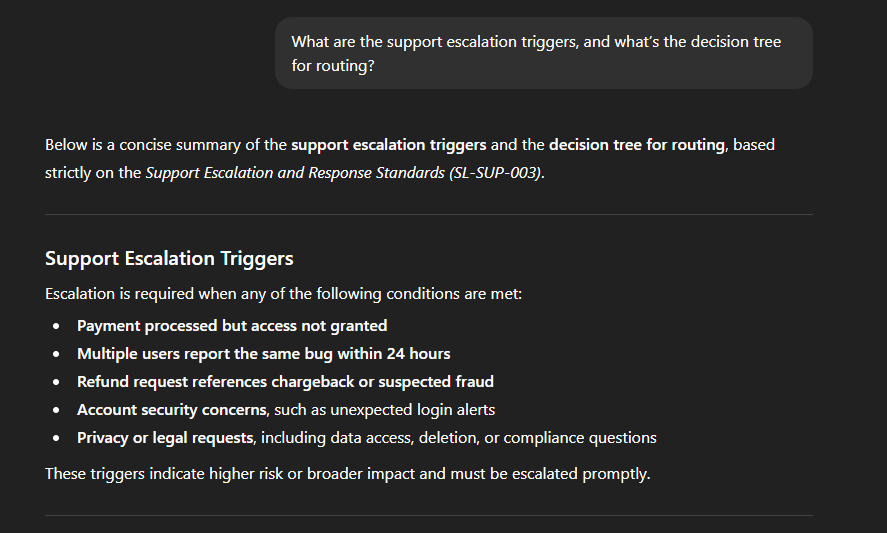 Add a “cite the doc” rule: In your instructions, ask it to mention which policy doc it used in the answer (example: “Based on the Remote Work Policy…”). That builds trust and helps employees verify details quickly.