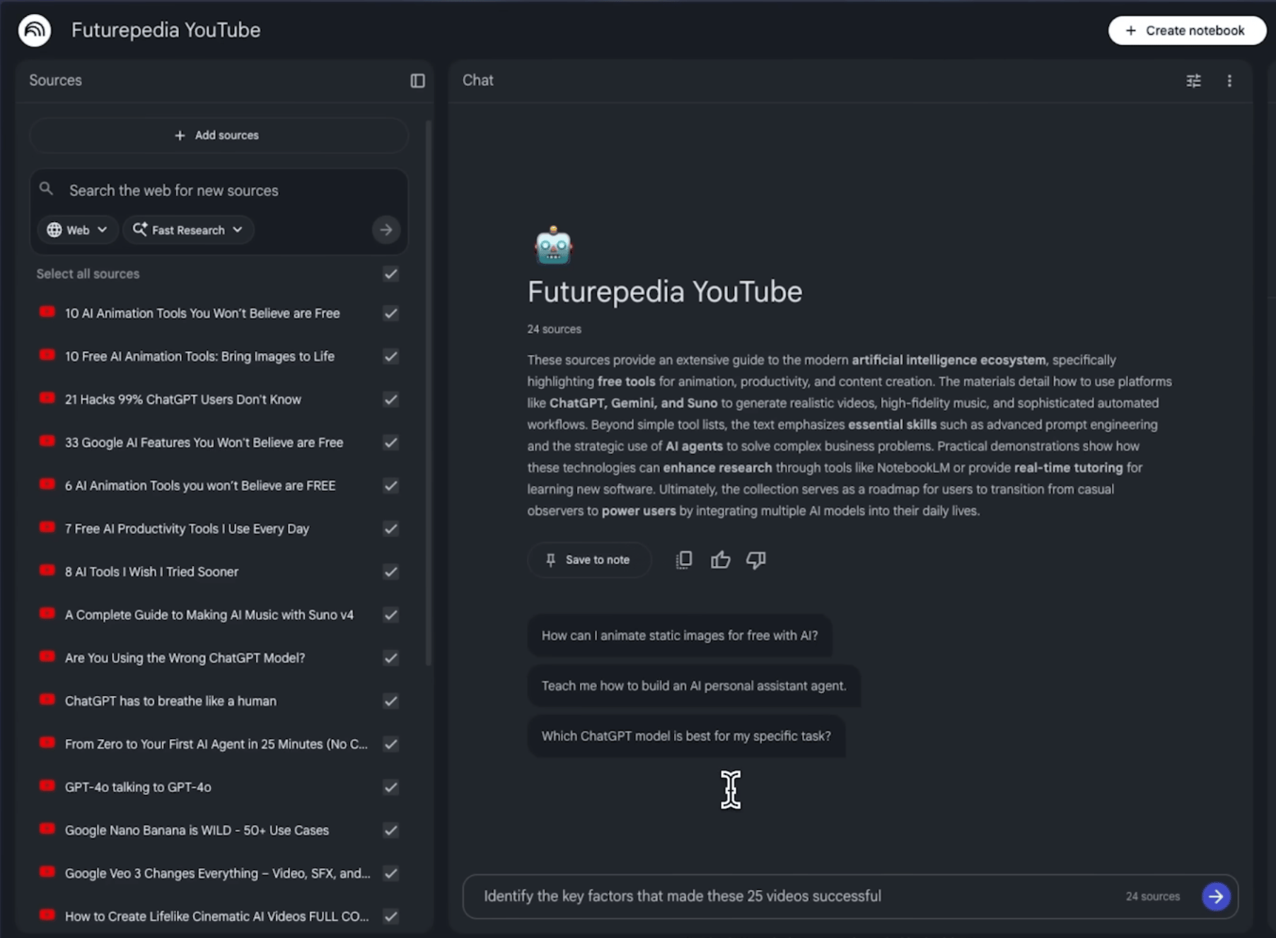 We started inside NotebookLM by adding the creator’s top-performing video links and an analytics export. That gave us one place to review what had already worked, including the wording, structure, and topics behind strong results.