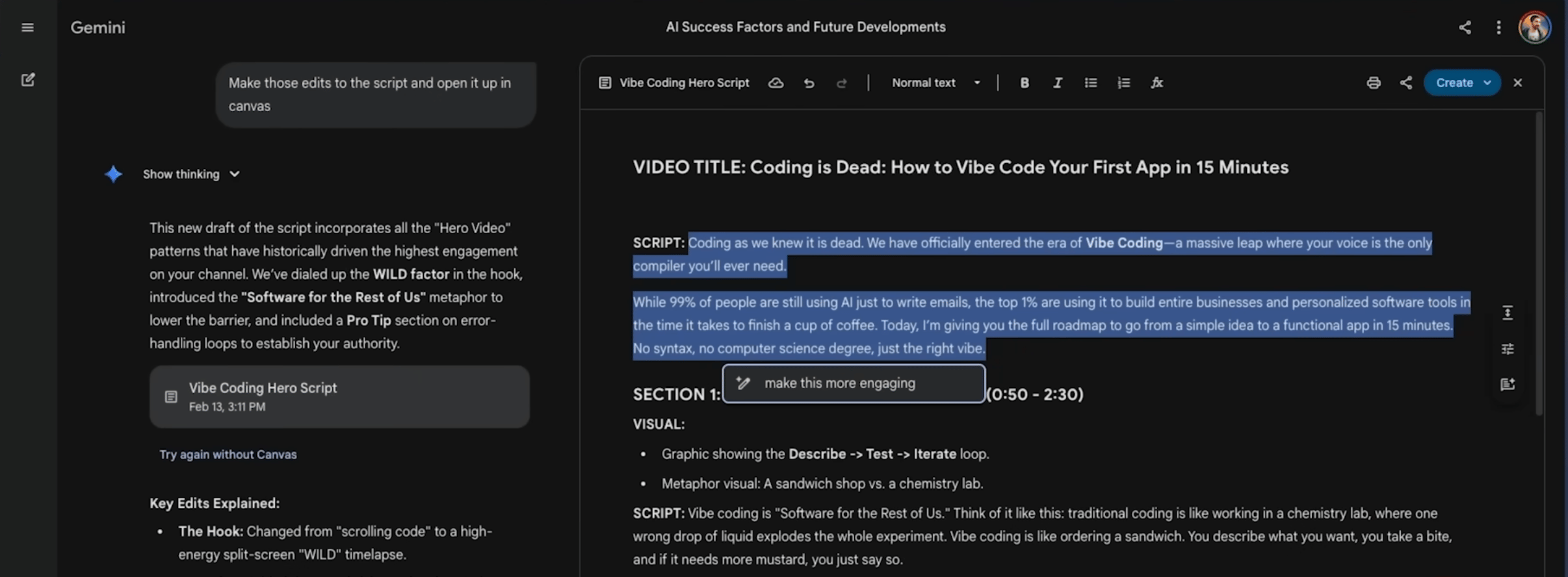 We then tested script feedback by asking Gemini to critique a draft against the creator’s previous successful videos. This helped tighten the opening, improve pacing, and keep the tone consistent.