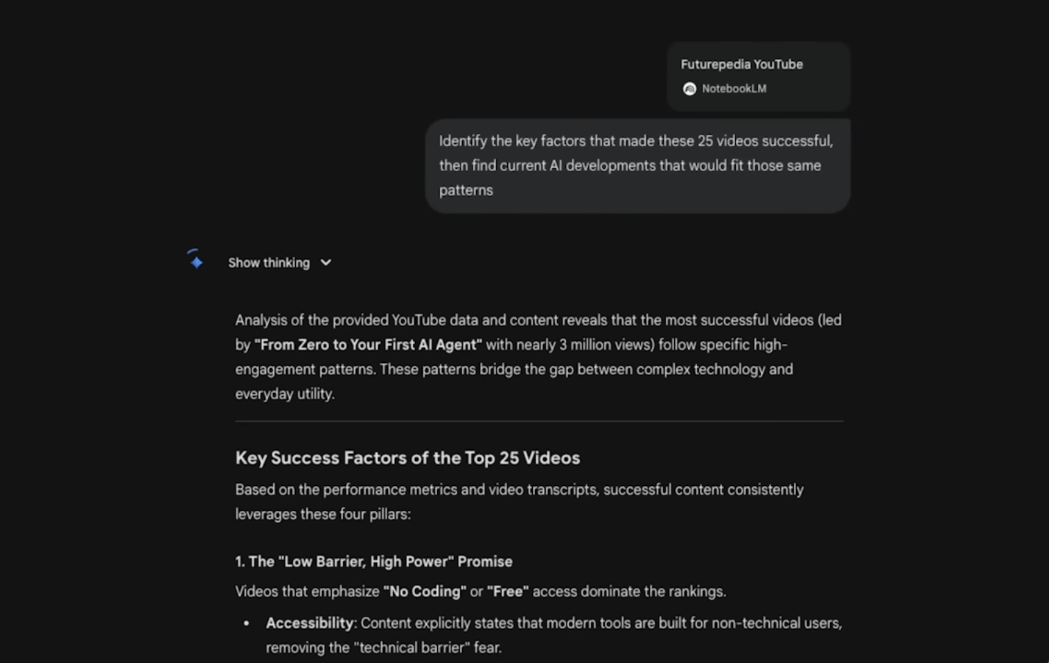 Next, we asked the notebook to identify what those successful videos had in common. It surfaced themes like topic framing, title style, and content structure, all with source grounding.