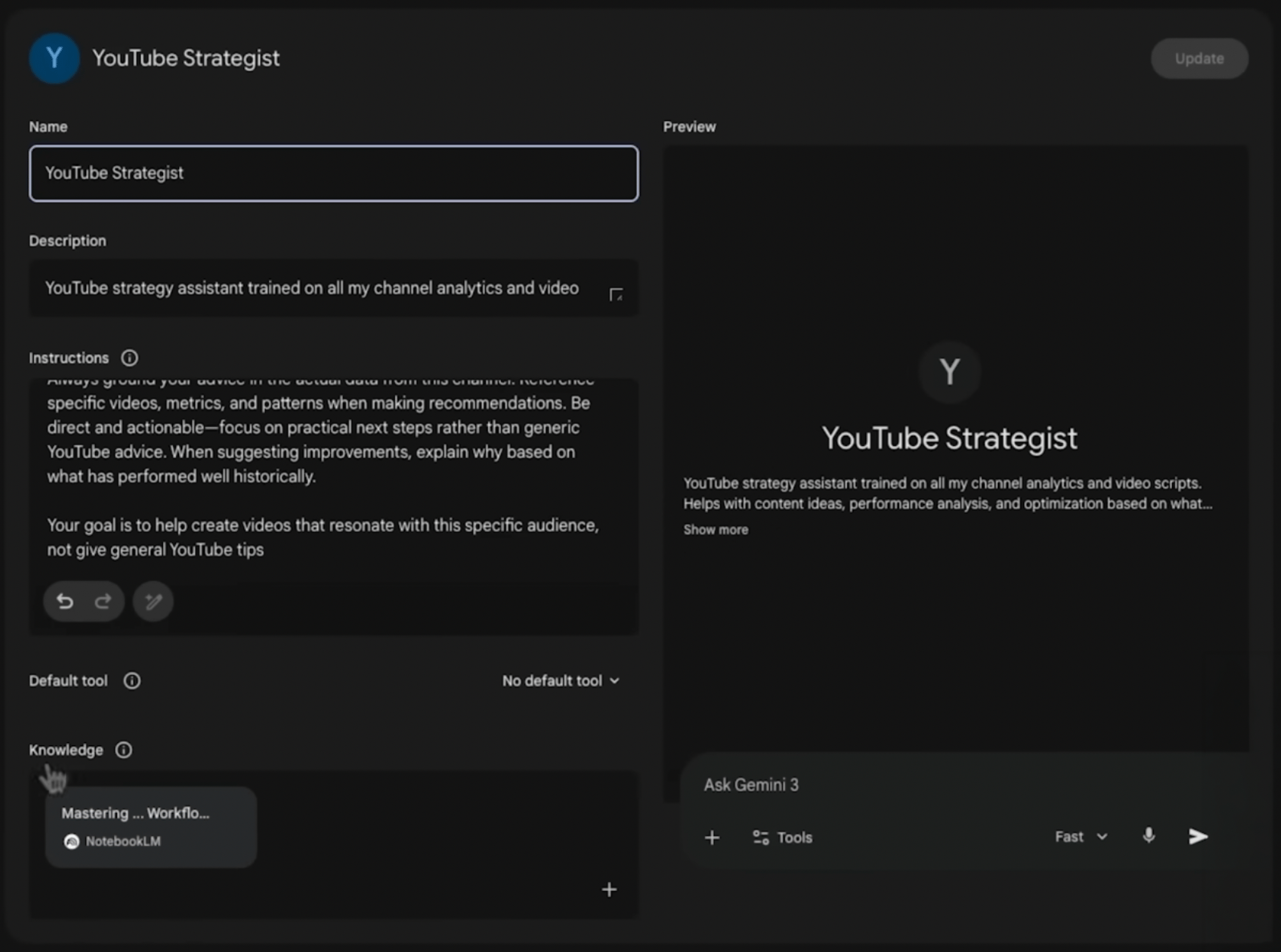 Finally, we saved the workflow as a Gem with custom instructions so the assistant would always act like a content strategist for that channel.