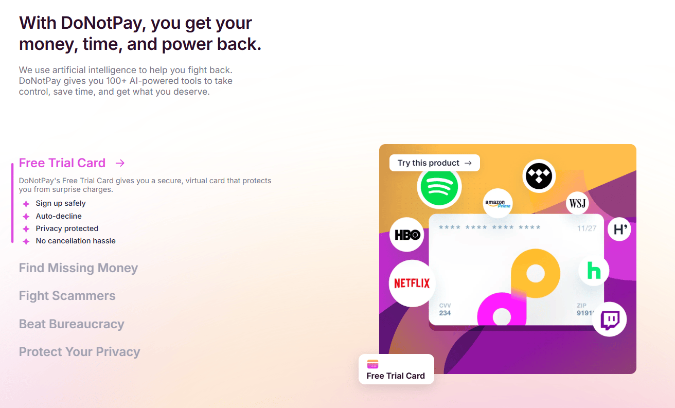 Paid Plan ($36 every 2 months): Subscription renews automatically and offers access to all DoNotPay features, including managing subscriptions, fighting robocallers, and over 100 automated legal and financial tools, with cancellation available anytime online