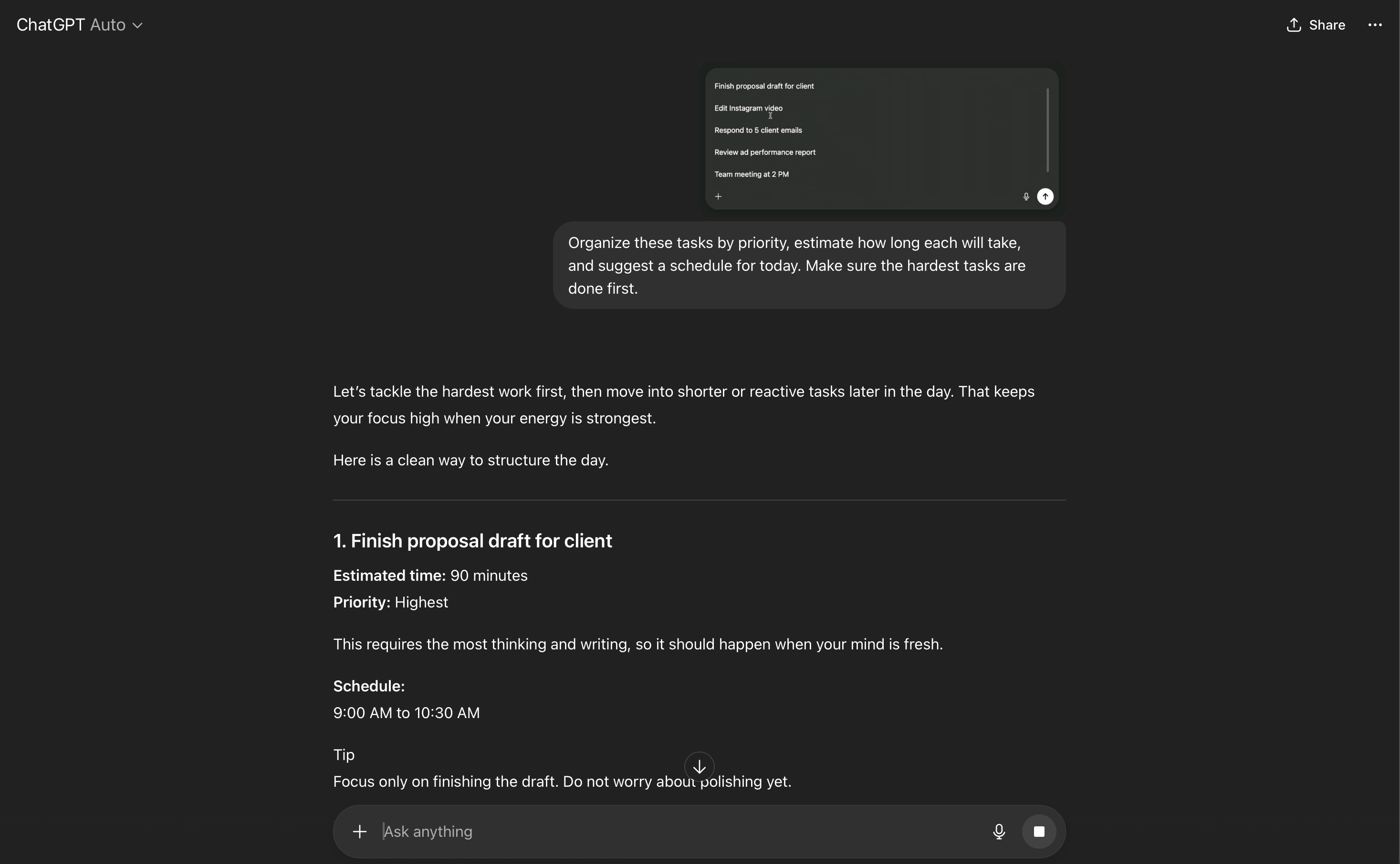 We began the day by pasting in a to-do list from a task manager. A screenshot works too. Then we used a prompt like:
