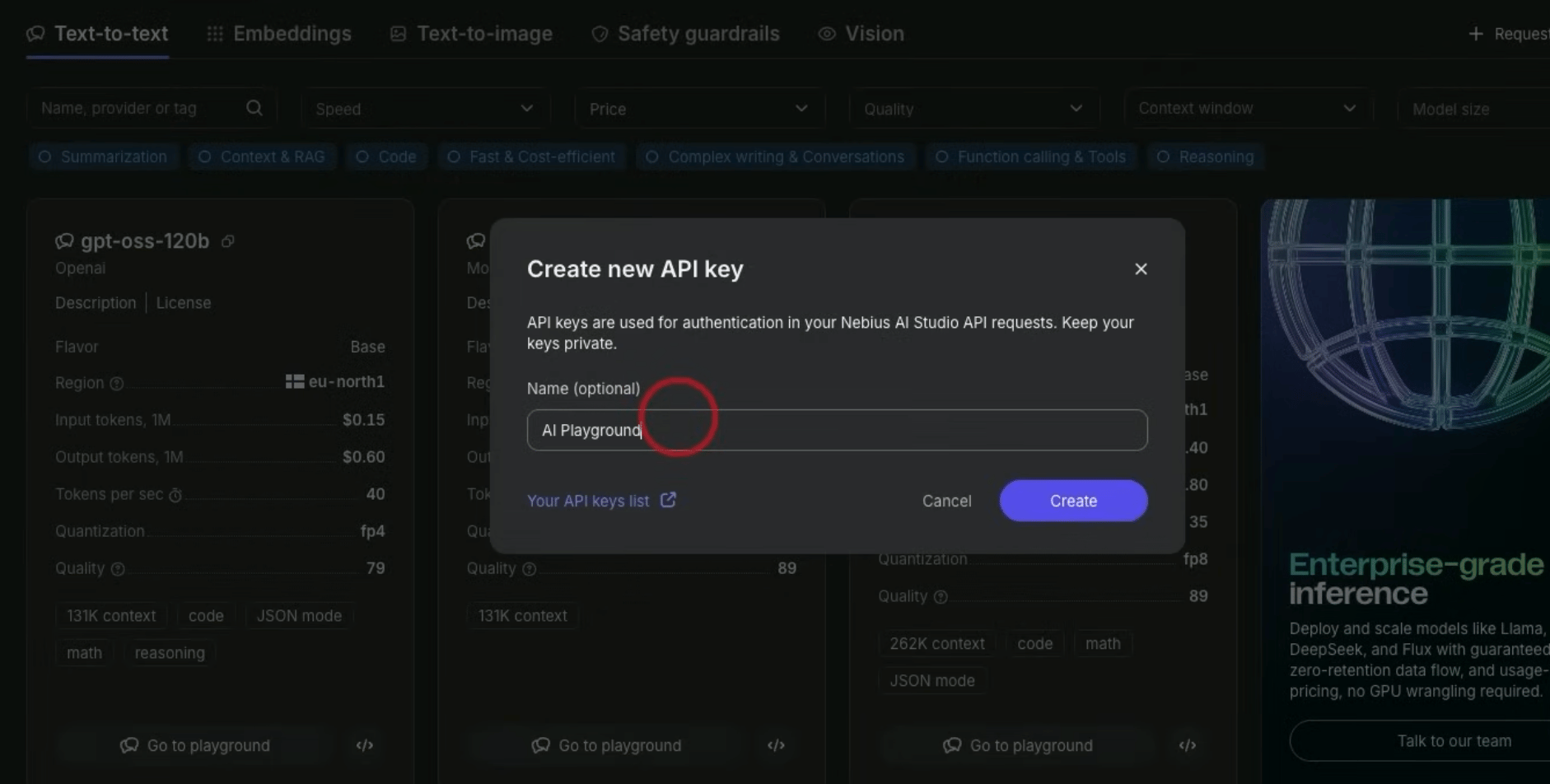 Open Nebius AI Studio and generate an API key for this project. Name it something obvious like “AI Playground” so you can track it later. Treat that key like a password.