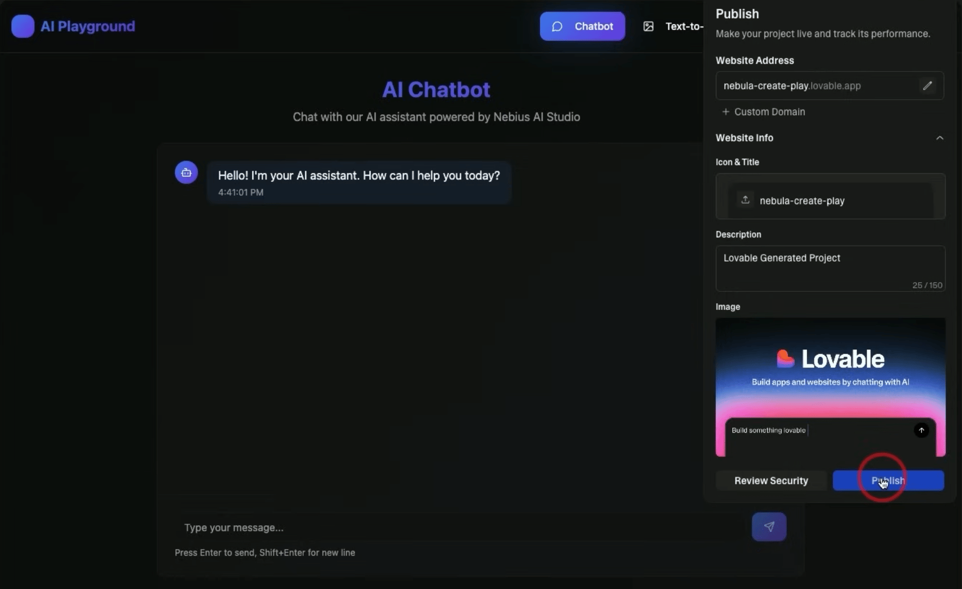 Ask Lovable to add a “New Chat” button so users can reset conversations without refreshing the page. Add a one-click light mode toggle so people can choose a theme. Then use the “Review security” option before publishing. Fix any issues it flags, then publish to generate a shareable link.