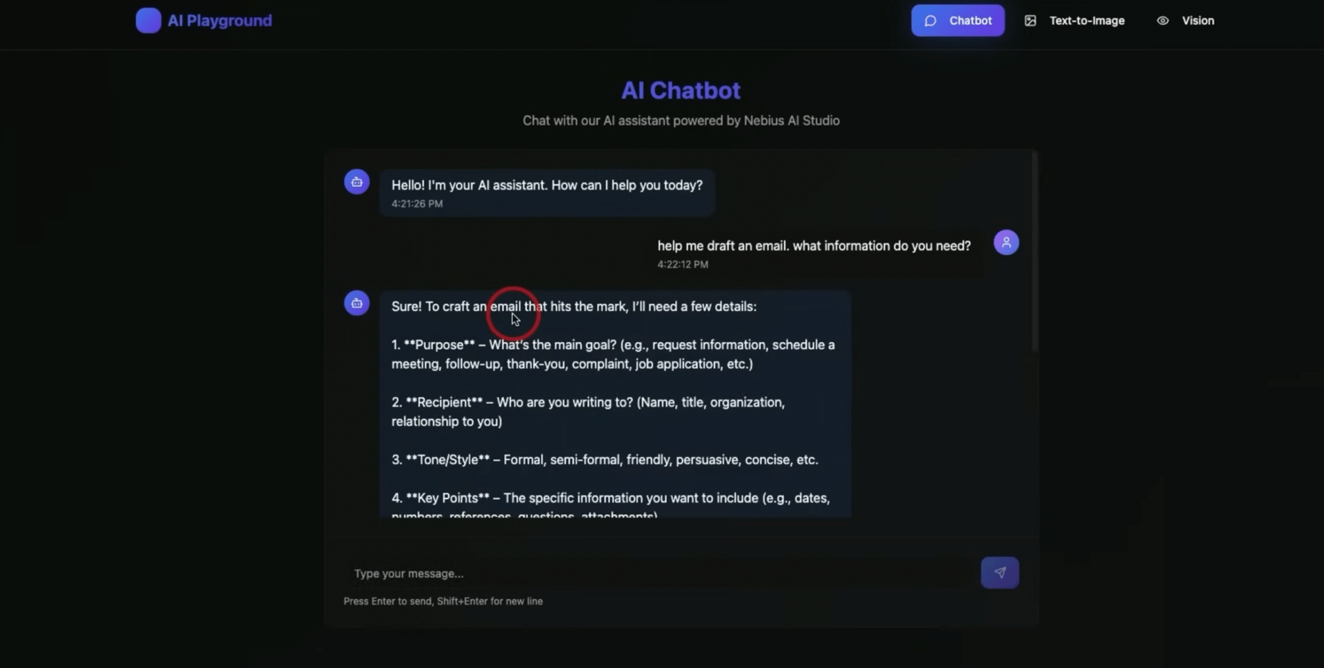 Ask Lovable to create a plan for connecting the chatbot, image generator, and vision analyzer to Nebius AI Studio using the API key stored in Supabase. You’ll see a detailed checklist. Then tell it to implement the plan.